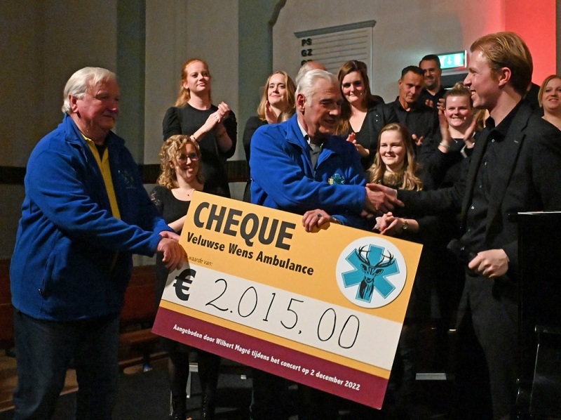 Er is een mooi bedrag € 2.015,00 overhandigd door Wilbert Magre aan de Veluwse Wens Ambulance.