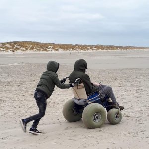 “De volgende dag zijn we rustig begonnen met ontbijt en om twaalf uur hadden we afgesproken in het hotel. Vervolgens gingen we tegen 13:00 uur kibbeling eten bij Zeevishandel Noordzee op ‘West’ en… dit ging er best wel in! Aansluitend was er een rustpauze ingebouwd in het huisje om daarna weer te vertrekken naar het hotel, want daar wachtte de volgende activiteit. Om 16:00 uur werden we opgehaald voor een strandrit met 4×4 voertuigen. Deze waren geheel belangloos ter beschikking gesteld door twee taxibedrijven op het eiland! Dankzij deze auto’s hebben we een uur over het strand gereden, wat prachtige beelden opleverde. Geweldig! Dank hiervoor!”Strandrolstoel