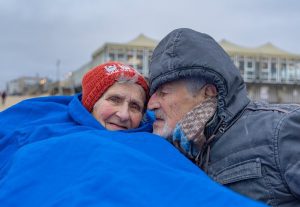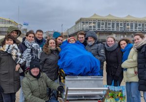 Eenmaal aangekomen in Egmond hebben we mevrouw op onze strandbrancard gelegd en lekker warm ingepakt met de elektrische deken en een winddichte hoes over haar heen. We reden met haar tot aan de vloedlijn.