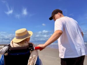 Op Terschelling begon de dag met een kop koffie/gebakje bij Zeezicht. Vervolgens uitwaaien aan het strand in een elektrische rolstoel. Onze grote dank gaat uit naar strandpaviljoen de Branding voor de goede service. Het kosteloos beschikbaar stellen van de strandrolstoel werd enorm gewaardeerd. Mama had zo ook de mogelijkheid om deze zelf te besturen.