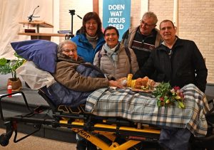 “De medewerkers van de Veluwse Wens Ambulance hadden maandagavond 23-01 een βthuiswedstrijdβ. Het woon- en bezoekadres waren beiden in Elburg. De wensvrager (90) wilde nog graag een repetitie-avond bezoeken van het koor βSaronβ waarvan zij al jarenlang de grootste fan is. Van te voren had zij al een aantal verzoek-liederen doorgegeven die zij graag wilde horen c.q. meezingen en die ook tijdens haar uitvaartdienst gezongen zullen worden. Toen zij de kerk van de V.E.G. in Elburg werd binnengereden klonk het lied βHeer, ik kom tot U; hoor naar mijn gebedβ. De dirigente van het koor had voor een verrassing gezorgd want hoewel het een repetitieavond was, waren alle koorleden in prachtige koorkleding, was er een organist Γ¨n een pianist aanwezig en een videograaf heeft de hele avond vastgelegd. Daarnaast waren haar kinderen en een groot aantal voor haar bekende gasten aanwezig. Tijdens de βrepetitieβ-avond waren er veel emotionele momenten en kreeg zij nog attenties van diverse koorleden. Aan het einde van de avond, bij het verlaten van de kerk, werd het lied βU zij de glorie, opgestane Heerβ gezongen. Emotioneel en ontroerd maar erg dankbaar voor deze avond hebben we haar weer naar huis gebracht.”