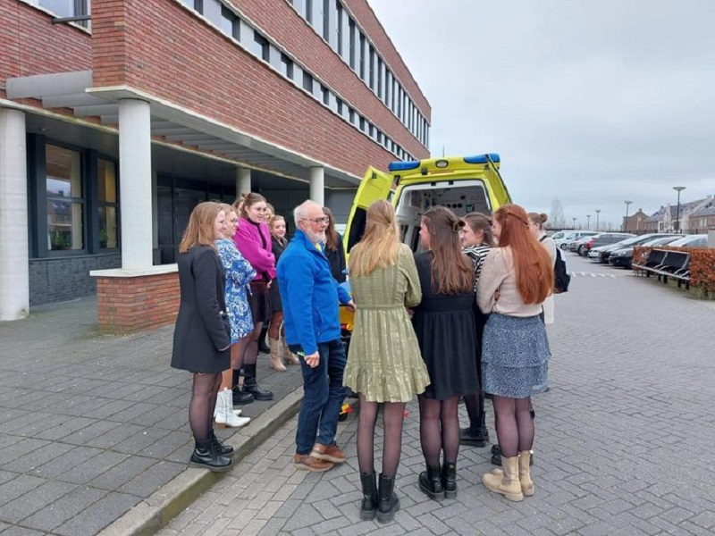 De studenten stelde veel leuke vragen en uiteraard hoort een blik in de ambulance er ook bij!