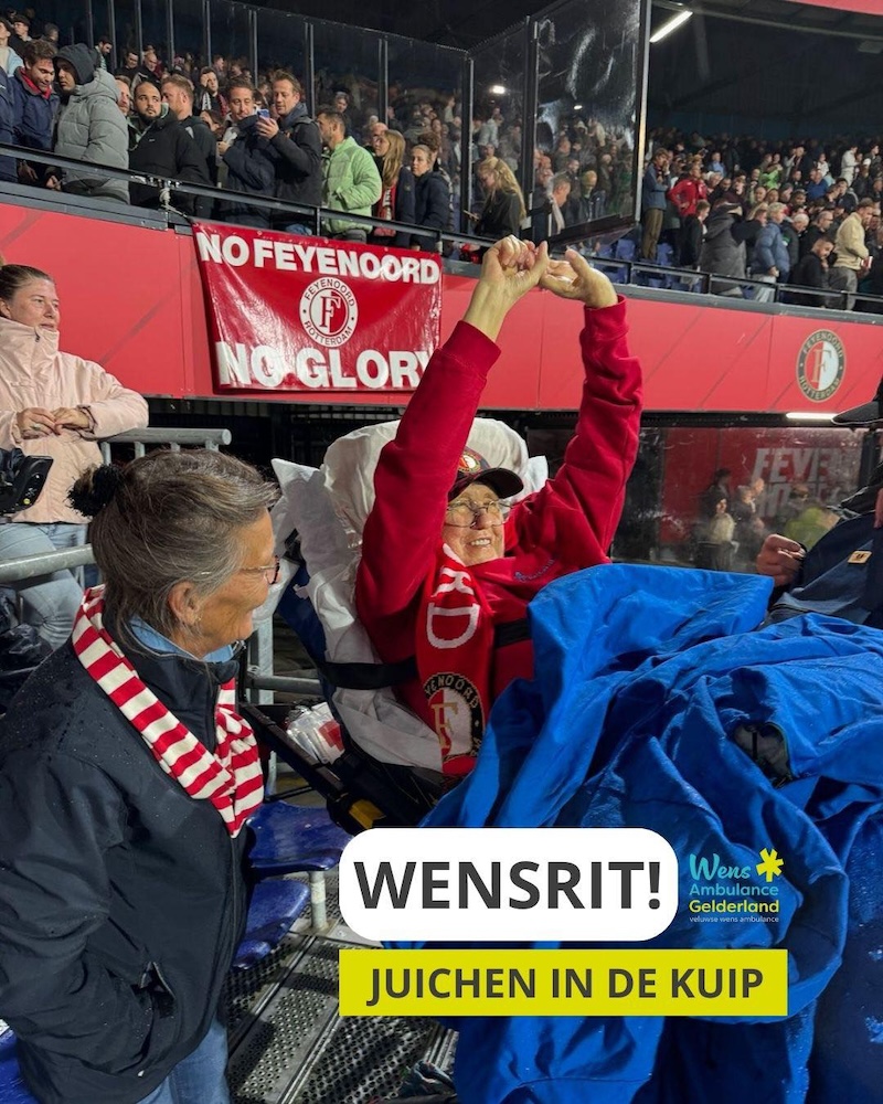 Op woensdag 17 september 2025 mochten wij onze wensvrager thuis ophalen om daarna naar haar geliefde club Feyenoord te gaan. Al sinds haar jeugd is ze fan van Feyenoord en zij wilde nog 1 keer naar een wedstrijd gaan om afscheid te nemen van de club en van De Kuip.