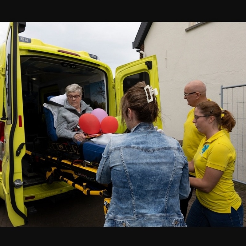 “Op vrijdag 13 oktober 2023 kwam de Veluwse Wens Ambulance mijn moeder ophalen om haar laatste wens in vervulling te laten gaan. Ze wilde nog heel graag het nieuwe verbouwde huis van haar jongste dochter die in Ammerzoden woont zien. Wat was het een comfortabele reis en wat zijn de mensen van de wensambulance sociaal en zorgzaam. We voelden ons echt op ons gemak. Mede door de wensambulance heeft ze een geweldige dag gehad. Bedankt, onze waardering is groot.”
