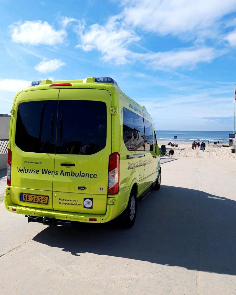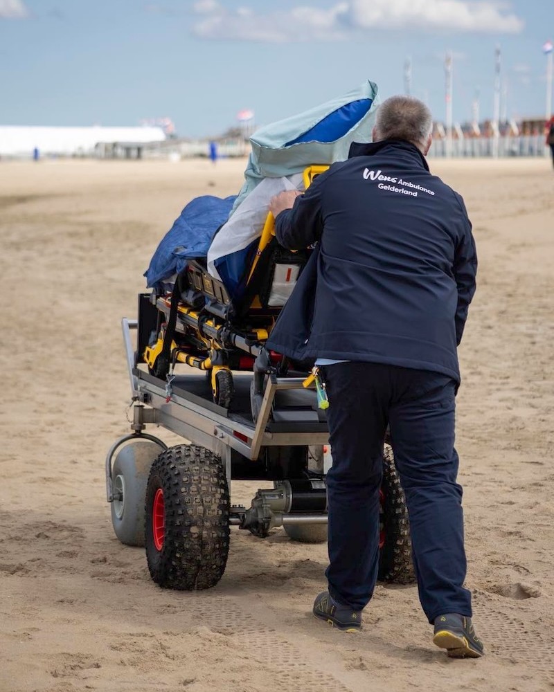 Omdat ‘nog één keer naar de zee gaan’ een vaak uitgevoerde wens is, hebben we op beide locaties de beschikking over een (elektrische) strandbrancard. Dat is een brancard op grote wielen, waarmee we zelfs over het strand kunnen rijden. Deze strandbrancards vervoeren we in een aanhanger die achter de ambulance wordt gekoppeld.