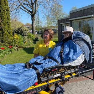 “De vrijwilligers van De Veluwse Wens Ambulance komen mijn man en onze vader opgewekt ophalen. Zijn grootste wens: nog even thuis in z’n eigen stoel zitten en genieten van het uitzicht en het zonnetje door het raam. Maar eerst even bij de jongste zoon langs om de metamorfose van de tuin gade te slaan. Er wordt terwijl wij het “project” bespreken hard gewerkt door de werklui. Met de woorden “Hier mag je trots op zijn!” sluiten we de eerste stop af. Op naar de ontmoeting zegt hij zelf.”