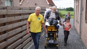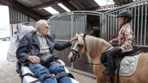 “Op 29 juli zijn we met deze meneer en zijn vrouw vanuit Lelystad naar de Blesse gegaan. Meneer wilde nog graag een keer zijn kleindochter Sofie zien paardrijden. Na eerst koffie gedronken te hebben bij dochter Kim en schoonzoon Richard gingen we op weg naar de paarden. De “manege Stegeman” in de Blesse had speciaal voor deze gelegenheid een privéles geregeld voor zijn kleindochter. Trots liet de achtjarige haar kunsten aan haar grootouders zien. In een half jaar tijd wist de amazone al goed hoe je een paard moet besturen. Opa was blij dat hij Sofie een keer met haar geliefde sport in actie had gezien! Na een innig afscheid keerden we weer moe maar voldaan terug naar Lelystad.”