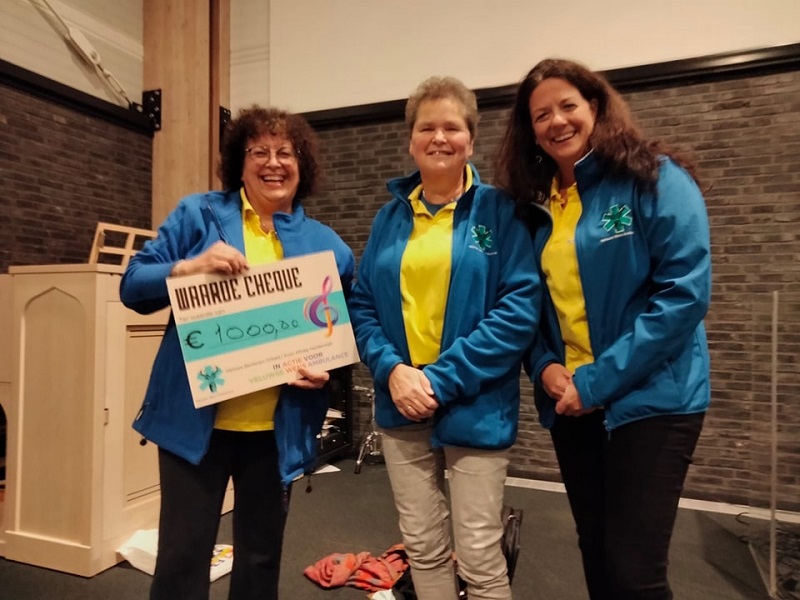 Dankzij de subsidie van de gemeente Harderwijk, de sponsoring van vijf Harderwijker bedrijven en de goede verkoop van entreekaartjes was het mogelijk de waardecheque van €1000,00 deze week te overhandigen aan de vrijwilligers Desiree, Truus en Helma van de Veluwse Wens Ambulance.