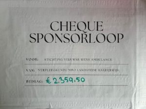 Dertien derdejaars studenten van de opleiding Verpleegkunde van de Landstede MBO uit Harderwijk hebben met een sponsorloop het prachtige bedrag van 2359,50 euro opgehaald voor de Veluwse Wens Ambulance. De studenten hebben de actie met elkaar bedacht. Ze hebben rondjes gelopen (in de regen) en allerlei artikelen verkocht. Op donderdag 4 april is de cheque door de studenten overhandigd.