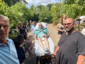 Het is heel mooi weer, maar de vrijwilligers van de wensambulance hebben het zwaar met al die heuvels in het park. Zelf vond ik het geweldig, vooral ook omdat ik dit nog samen kon doen.