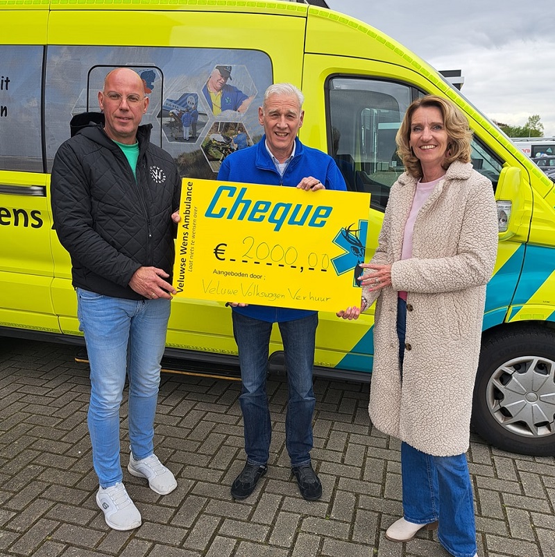 Op 24 april kreeg onze penningmeester een cheque ter waarde van €2.000,- overhandigd van het bedrijf Veluwe Volkswagen Verhuur. De eigenaren openden op 23 maart een nieuwe showroom / werkplaats aan de Zuiderzeestraatweg te Oldebroek. Alle genodigden die bij de opening aanwezig waren, werden gevraagd een donatie te doen voor de Veluwse Wens Ambulance. In hun showroom staan een zestal fraaie vintage Volkswagenbusjes type T1 en T2 die gehuurd kunnen worden. Ook kever cabrio’s en twee Porsche cabrio’s zijn beschikbaar voor de verhuur.
