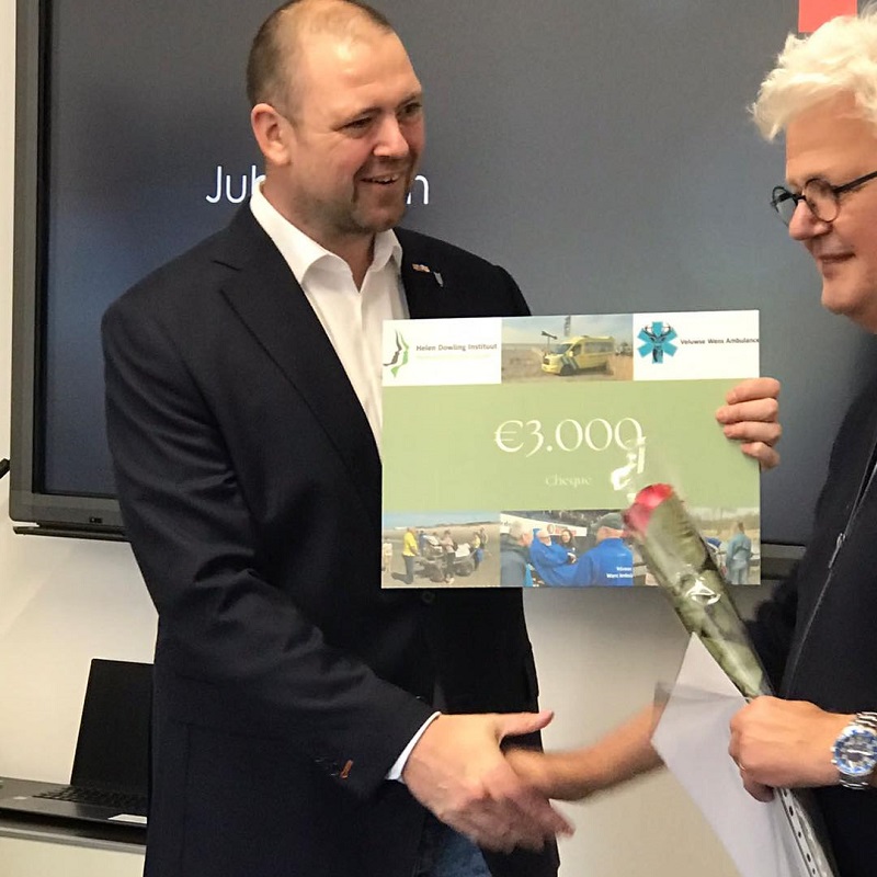 Hans: “Ik werk 3 dagen per week bij het Helen Dowling Instituut. Het Helen Dowling Instituut helpt mensen met oncologische psychologische therapie. Wij zelf zijn, net als de Veluwse Wens Ambulance, een goed doel en voor een deel afhankelijk van donaties en giften. Er worden door ons een aantal evenementen georganiseerd om fondsen binnen te halen die ons in staat stellen door te gaan met ons werk.