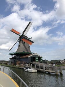 Met een zonnetje en wolkje aan de lucht en via een sluis en onder, al dan niet bruggen die geopend moesten worden, voeren we naar de Zaanse Schans. Tijdens deze vaartocht werd ons een heerlijke lunch aangeboden!